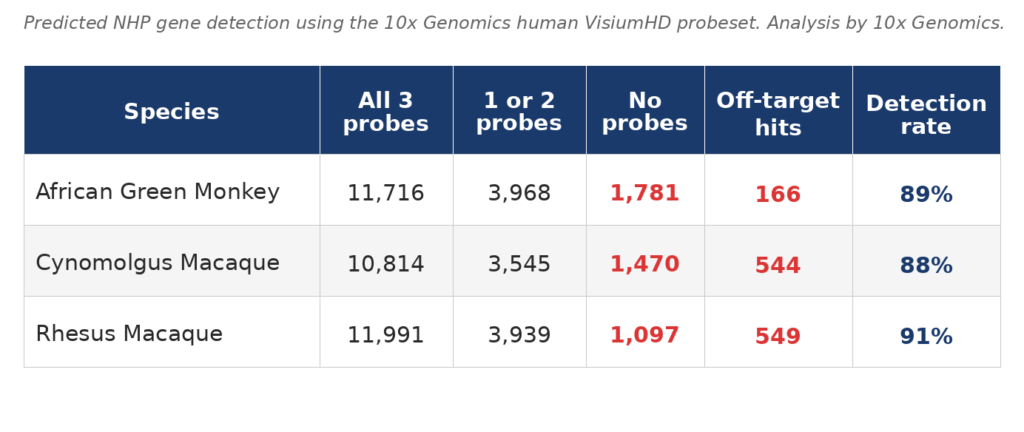 3DG has validated VisiumHD on non-human primate tissue using the human probeset. The table below shows predicted gene detection rates across three NHP species, based on probe homology analysis performed by 10X. Each gene is detected by 3 probes and about 90% of NHP genes are predicted to be detected by at least one human gene probe.